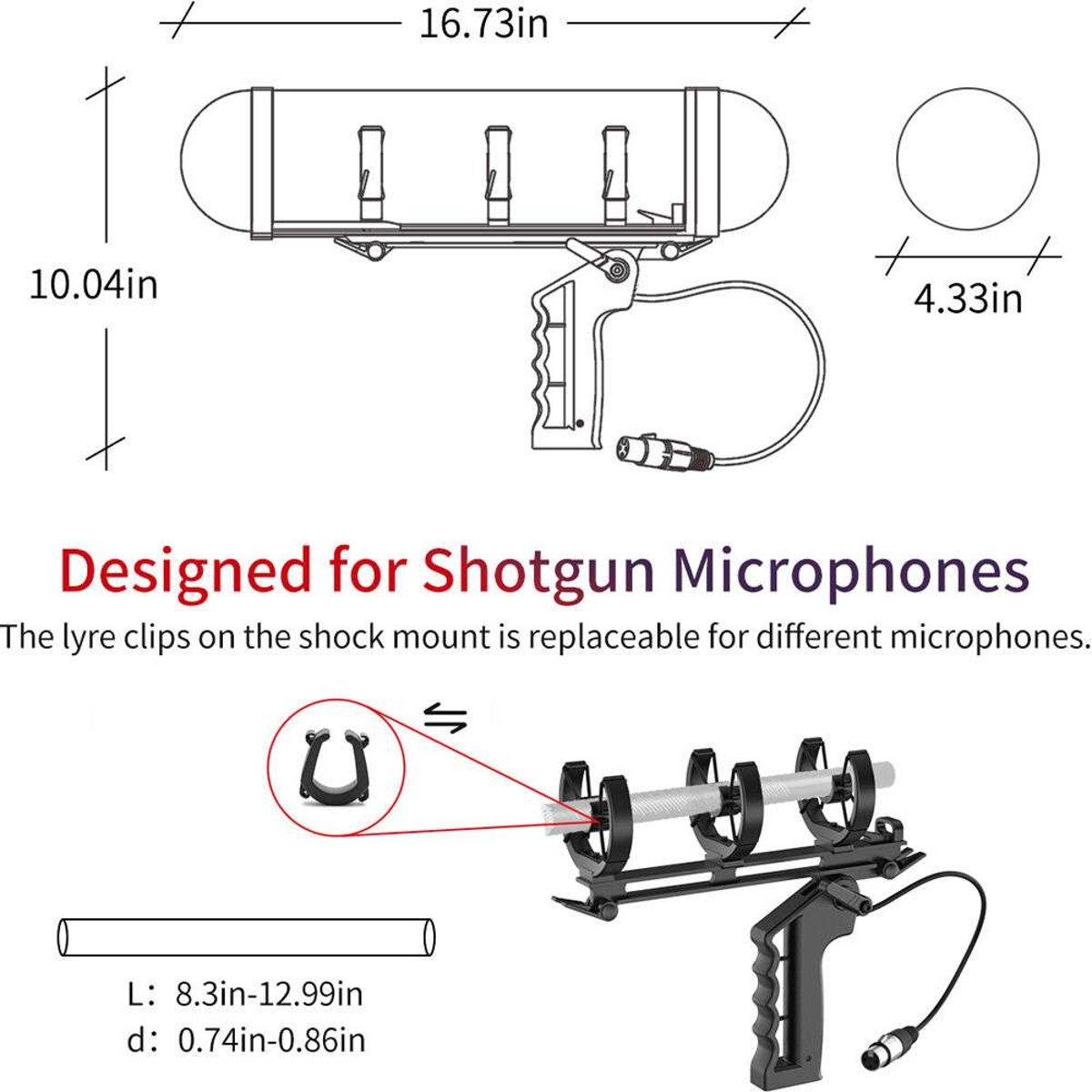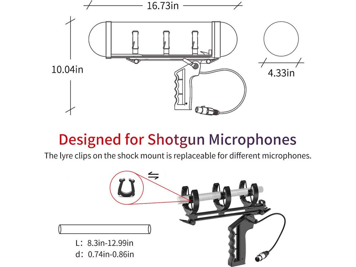 The KT 8 accommodates shotgun mics measuring 8.3 to 13" in length, with diameters of 0.75 to 0.86". That's a wide range of microphones indeed, and the built-in lyre clips on the shockmount can be replaced to suit different mic models. An XLR cable is included.