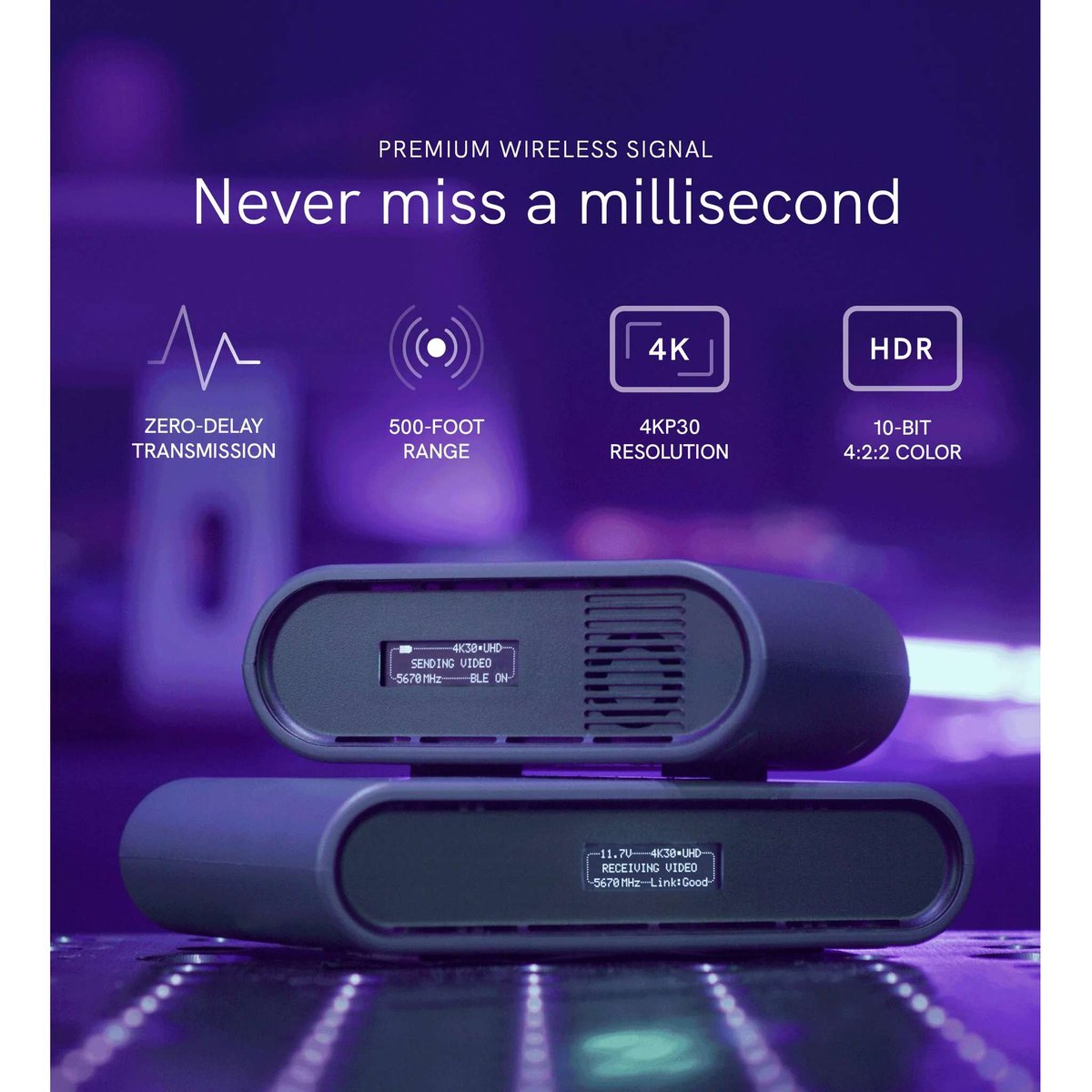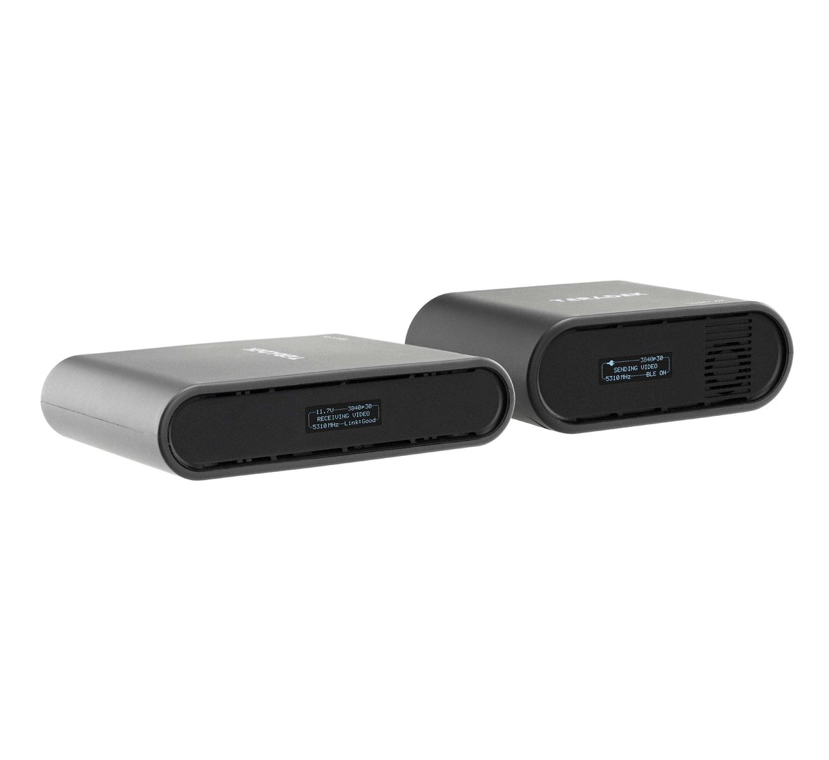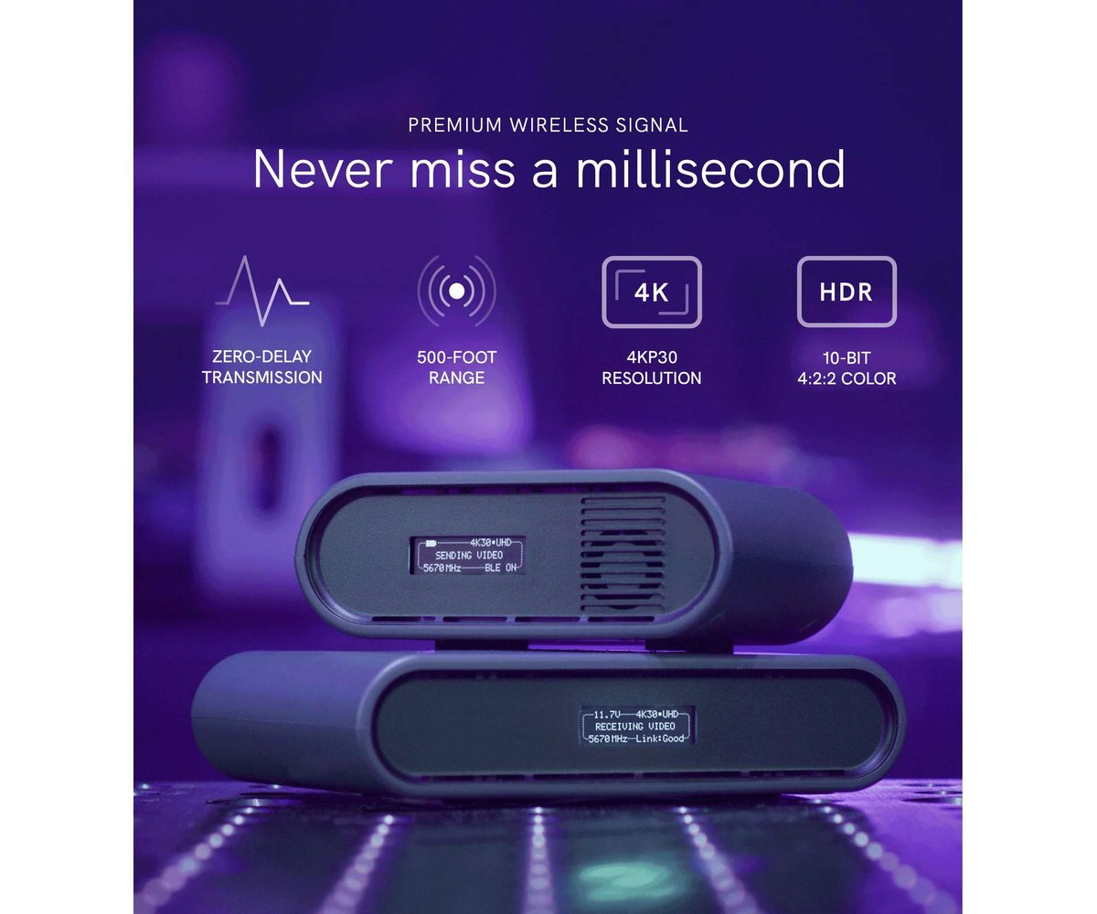 Transmit lossless HD video up to 150m to monitor video wirelessly using the Spark 4K Transmitter/Receiver Set from Teradek. The kit includes one Spark 4K transmitter and one Spark 4K receiver, and the transmitter can input up to 4K30 10-bit 4:2:2 HDR video via HDMI and transmit visually lossless video to up to two Spark 4K receivers with zero delay. The transmitter and receiver communicate using a powerful signal that can travel up to 500' line of sight, and each unit features a bright OLED display to view the unit status.
