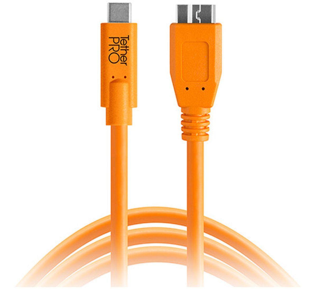 With this orange, 15 ft long Tether Tools TetherPro USB Type-C Male to Micro-USB 3.0 Type-B Male Cable, you can connect a camera, smartphone, or other USB Type-C device to a computer, for the purposes of transferring data. This cable supports USB 3.0 for data transfer rates of up to 5 Gb/s.