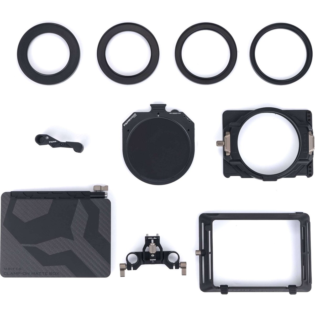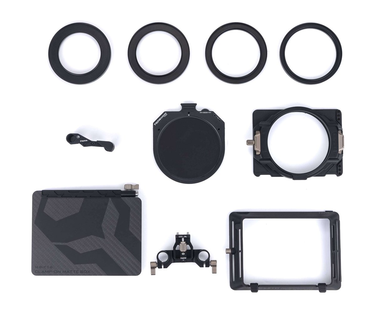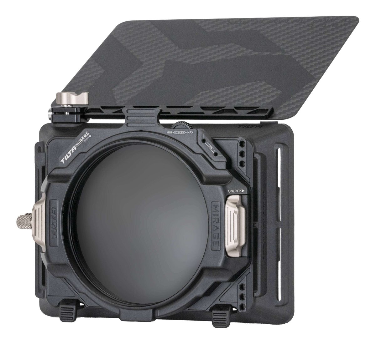 Built rugged for daily use on your camera rig yet lightweight for handheld, gimbal, stabilizer, or drone work, the Tilta Mirage VND Kit is a modular component system that clips onto 95mm OD lenses. The included variable ND system allows you to precisely adjust the ND effect from 0.3 to 2.7 stops when needed. The matte box weighs about the same as a standard 4 x 5.65" glass filter, and it accepts Tilta's 95mm round filters with the included filter adapter. The modular design means you can configure the matte box to match your needs on a shot-by-shot basis.