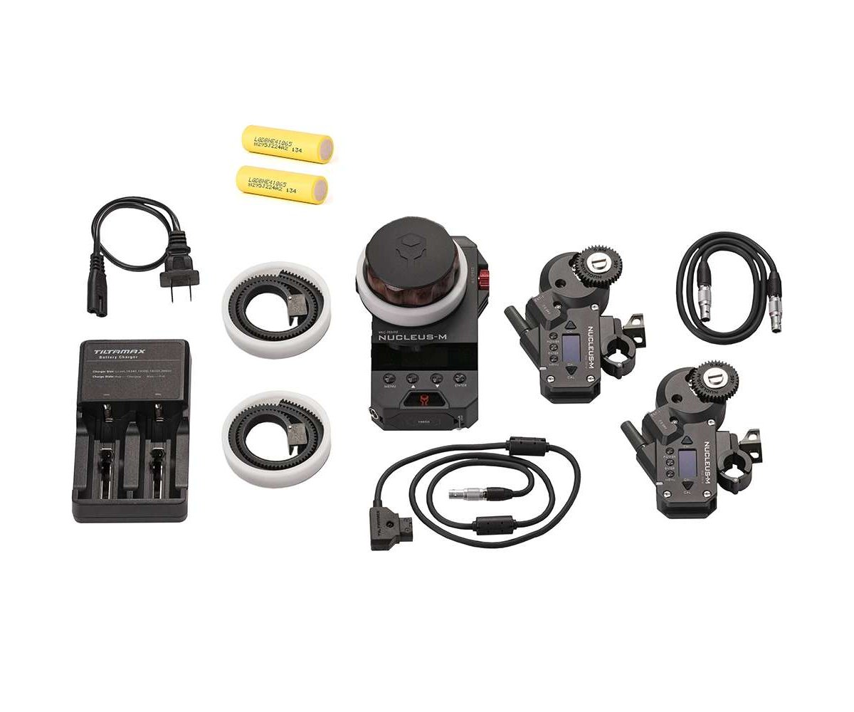 The Tilta Nucleus-M Wireless Lens Control System Partial Kit IV contains the essential elements for pulling focus and iris wirelessly. The kit includes the Nucleus-M FIZ hand unit controller, two Nucleus-M motors, two removable lens belts (DSLR Lens Follow Focus Adapters), two motor power cables, two marking disks for the hand unit, a lanyard for the hand unit, and a battery charger unit. The system enables an AC to pull focus and iris on a prime lens. If you are using a lens that does not have standard cine-style gears, then use the included lens belts to add gears to your lens.