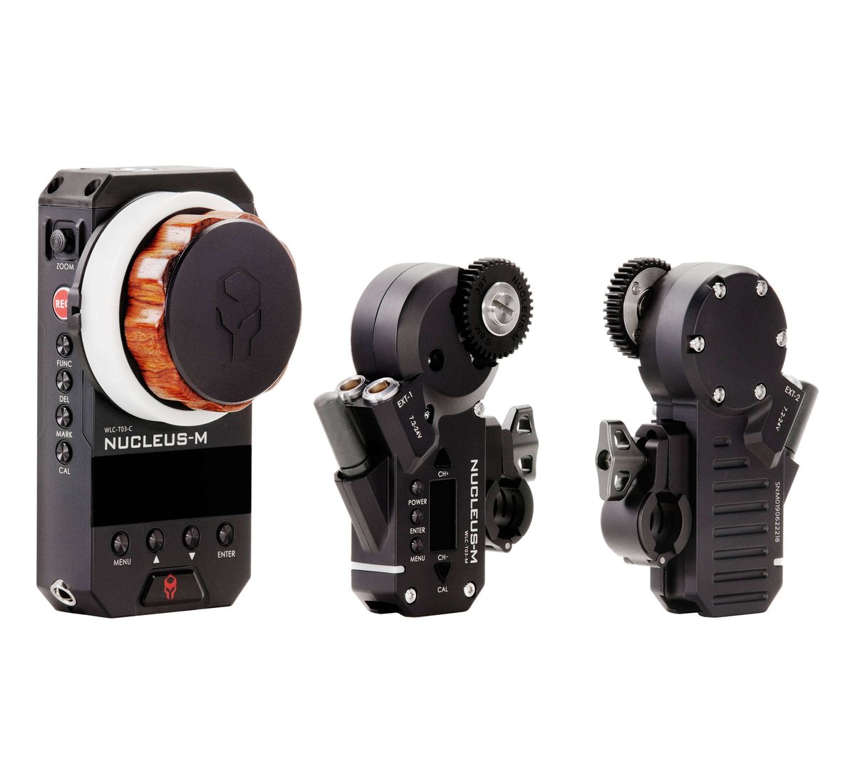 The Nucleus-M wireless motor includes a cine standard 0.8 Mod drive gear and a 19mm rod adapter with a bushing for mounting onto a 15mm rod. The motor features automatic or manual calibration, a display window, and high, medium, and low torque settings.