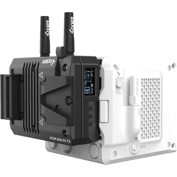Wirelessly transmit and receive up to 1080p60 video to monitor your RED KOMODO camera with this ATOM 600 KV Wireless TX/RX Kit from Vaxis. This transmitter and receiver kit allows you to wirelessly transmit 1080p60 video signals to the Vaxis ATOM 500 SDI receiver with less than 80 ms latency. The transmitter sends a powerful line-of-sight signal up to 600'.