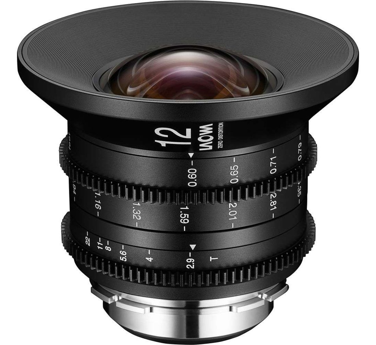 Il 12mm cine presenta un’apertura massima T2.9 ed è costruito con uno schema ottico di 16 elementi in 10 gruppi. Il diaframma a 7 lamelle produce un bokeh morbido e gradevole, con profondità di campo ridotta e distorsione pressoché nulla, mantenendo una distanza minima di messa a fuoco di 18 cm. Le ghiere di messa a fuoco e diaframma adottano dentatura standard cinematografica 0.8 MOD, compatibile con i sistemi follow focus professionali. Il diametro frontale da 102 mm può essere portato a 114 mm tramite l’anello step-up incluso, per l’integrazione con matte box standard di settore, utili per il controllo di flare e riflessi e per l’impiego di filtri. Le scale di messa a fuoco, diaframma e profondità di campo sono incise in piedi sul lato dell’ottica, a supporto del lavoro del focus puller.