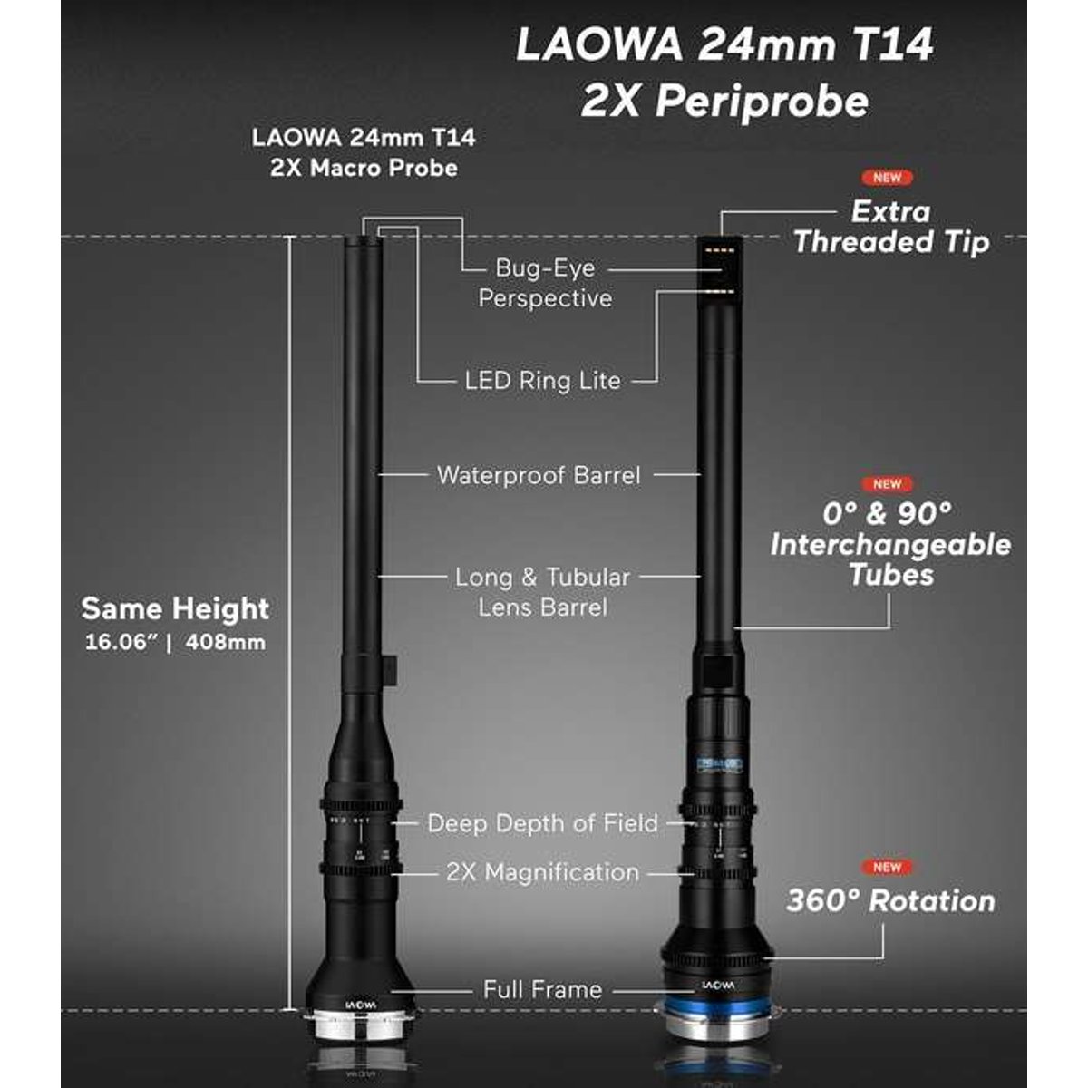Il LAOWA 24mm T14-40 2x PeriProbe Cine Lens di Venus Optics consente di realizzare riprese macro ingrandite e nitide su sensori full-frame con attacco Canon EF, con lunghezza focale di 24mm. Il tubo ottico in stile periscopio, con terminali intercambiabili, offre un’apertura variabile da T14 a T40 per gestire profondità di campo estese o più selettive. Può essere utilizzato sott’acqua o in spazi ristretti grazie al barilotto frontale impermeabile e al profilo estremamente sottile.