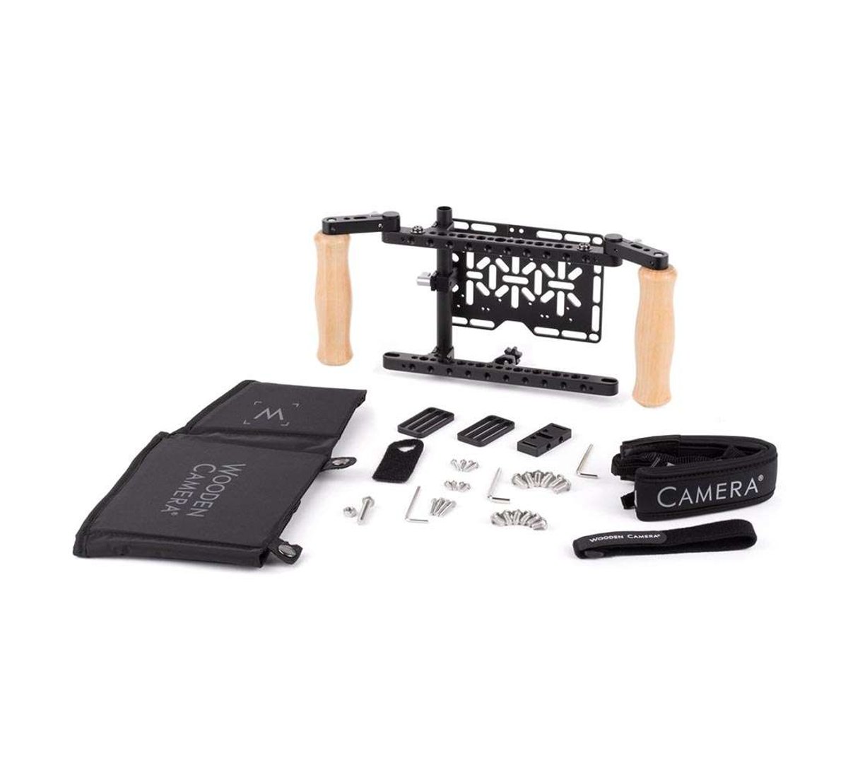 The DMCv2 arrives mostly pre-assembled, with simplified, rod-based height adjustment. Ergonomic wooden hand grips can be quickly positioned via the built-in 15mm clamps. The battery mounting plate features V-Mount and Gold Mount attachment points as well as swing away functionality for easy access to the rear of the monitor and installed wireless devices. The cage includes a built in baby pin clamp with locking thumbwheel for stand mounting.